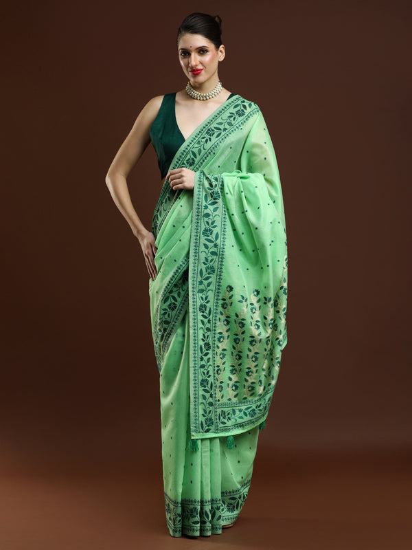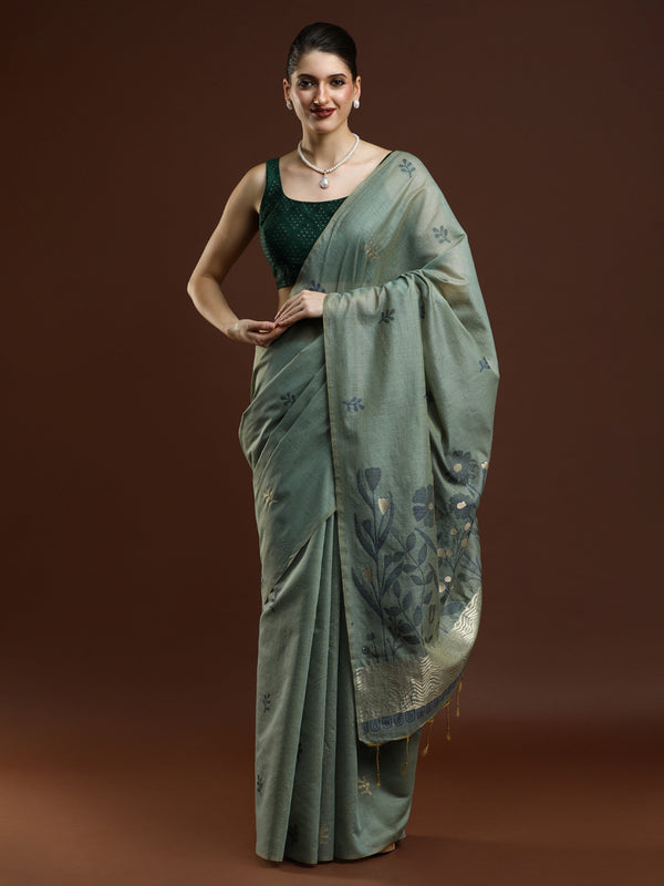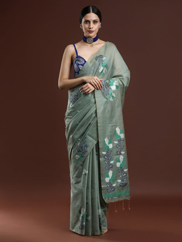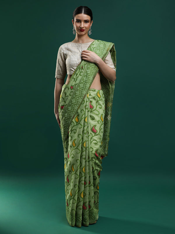 Woven Design Ethnic Motif Muga Cotton Saree in Green