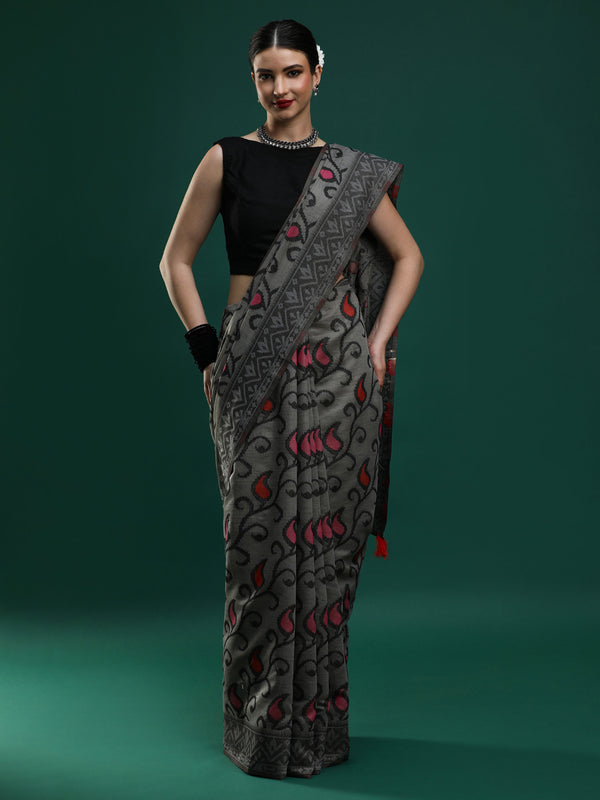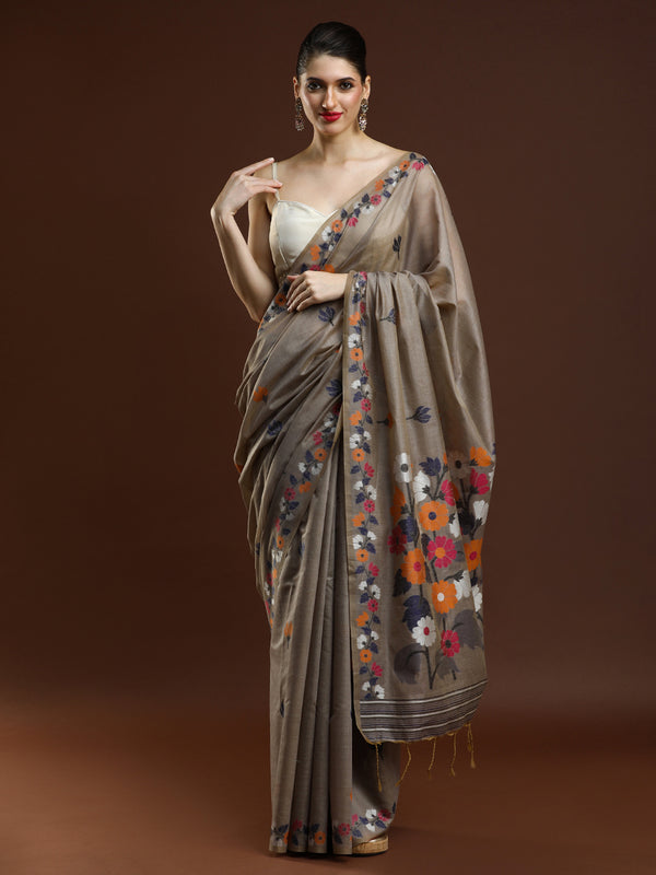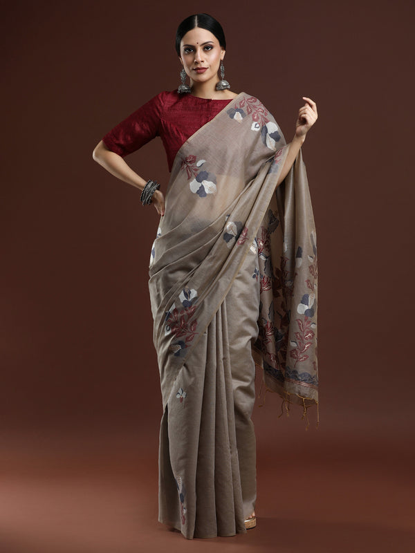 Woven Design Floral Chanderi Cotton Saree in Grey