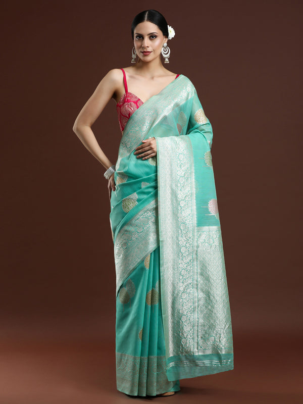 Woven Design Floral Chanderi Cotton Saree in Sea Green