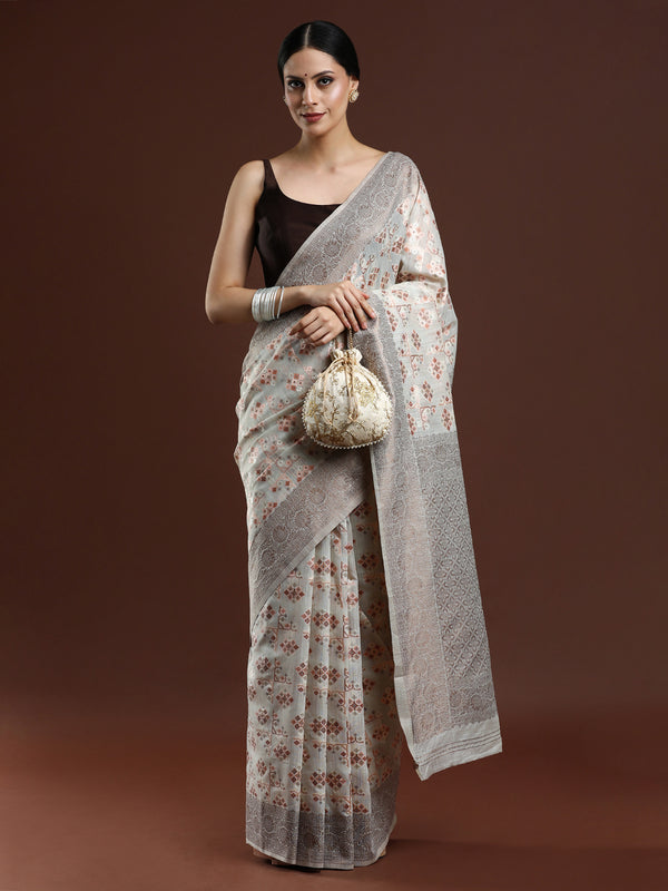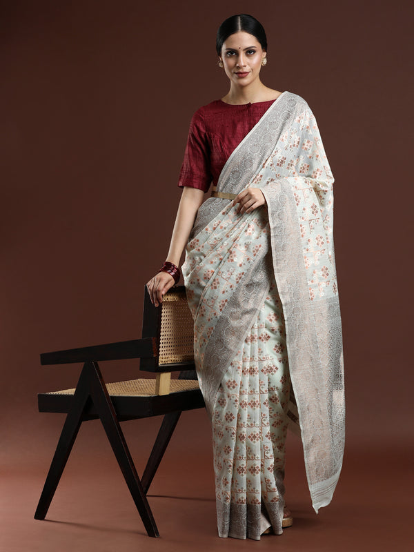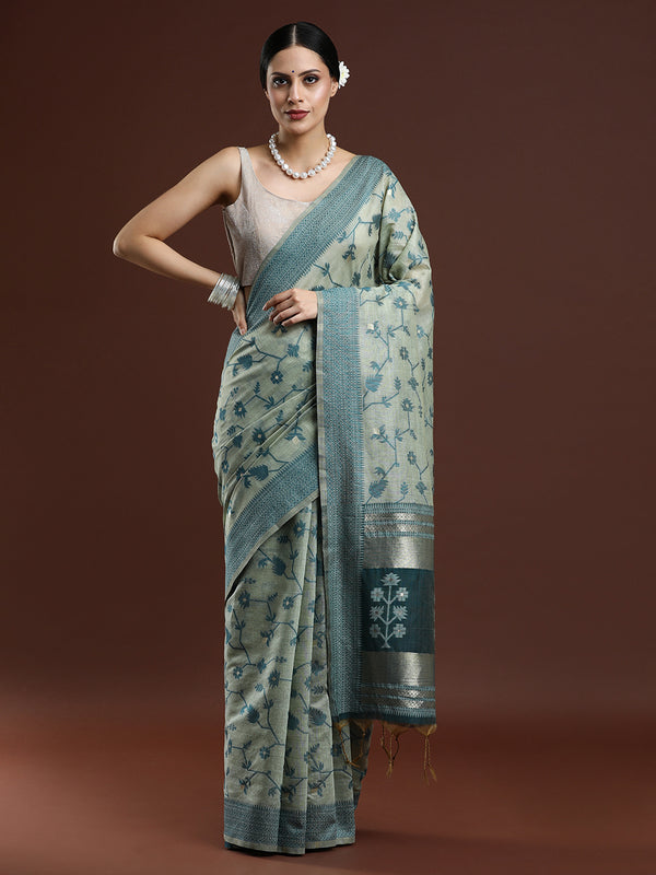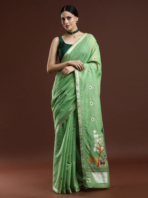 Woven Design Floral Chanderi Cotton Saree in Pista Green