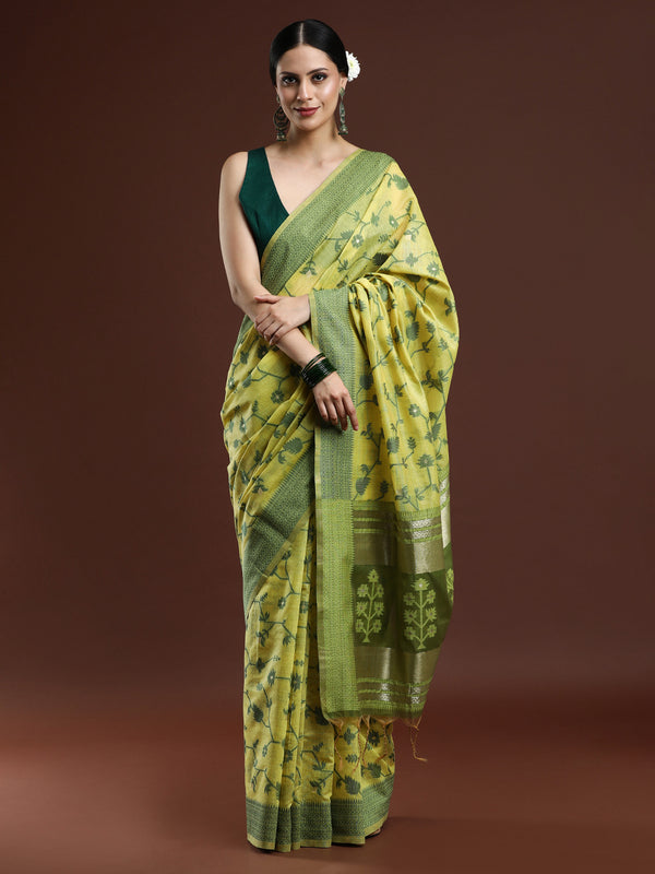Woven Design Floral Chanderi Cotton Saree in Lime Green