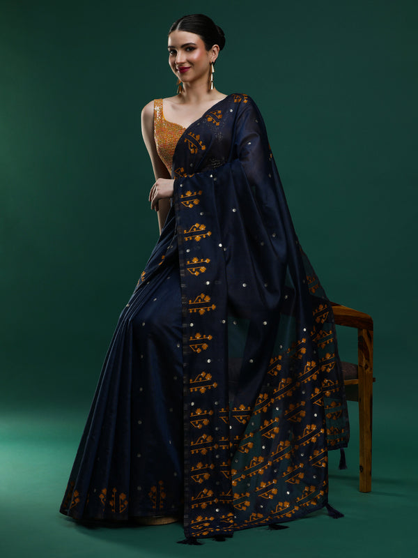 Sarha Ethnic Motifs Print Cotton Blend Celebrity Muga Saree in Navy Blue