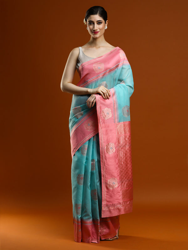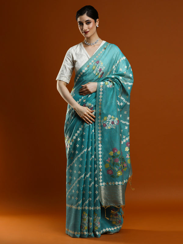 Sarha Floral Motifs Woven Design Zari Chanderi Saree in Light Blue