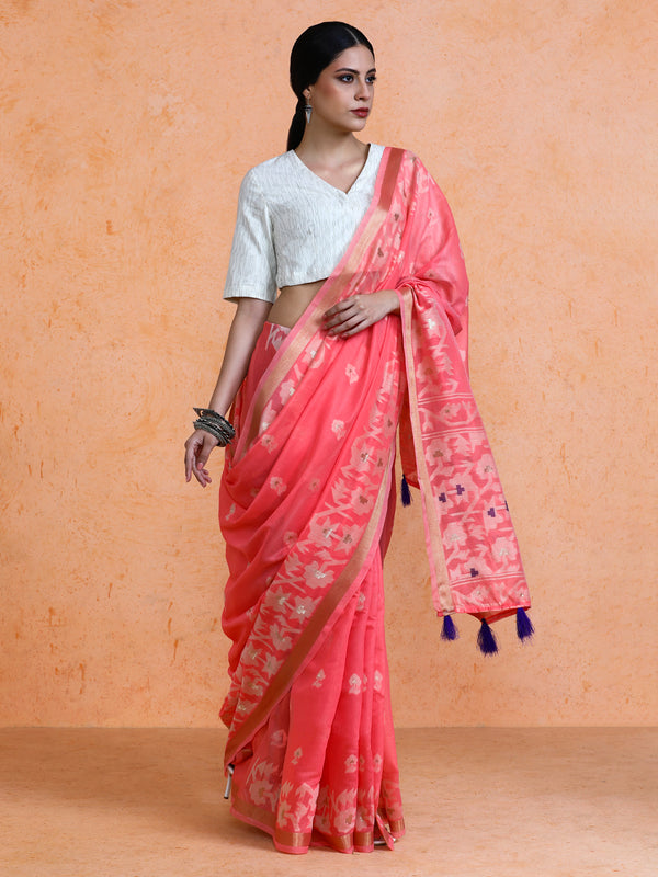 Sarha Women Floral Woven Design Zari Chanderi Saree in Pink