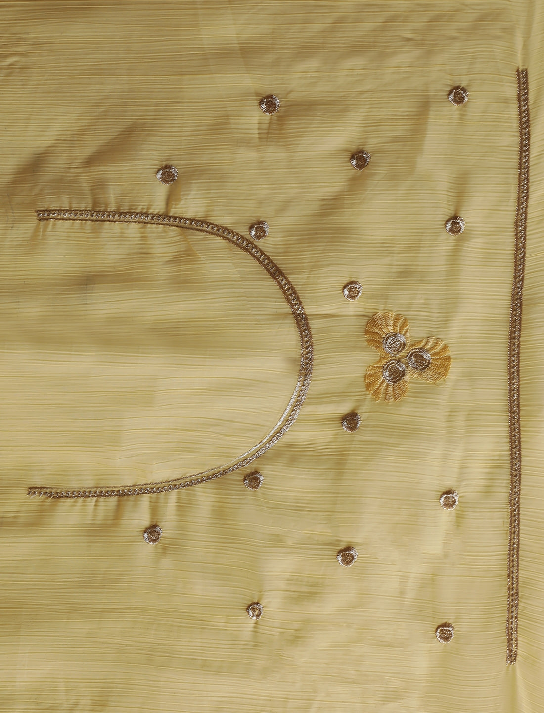 This saree stands out with its unique motifs delicately enclosed within circular frames, giving it a graceful and artistic appeal. The borders are enriched with intricate leaf-inspired embroidery, adding texture and depth to the drape. Horizontal embroidered lines enhance the overall structure, lending a refined flow. A perfect blend of elegance and creativity, it beautifully balances tradition with a touch of whimsy.