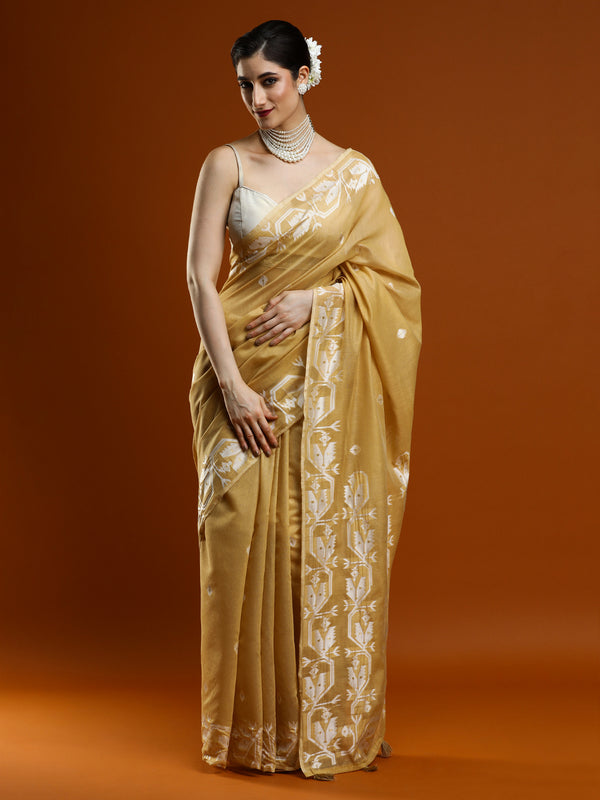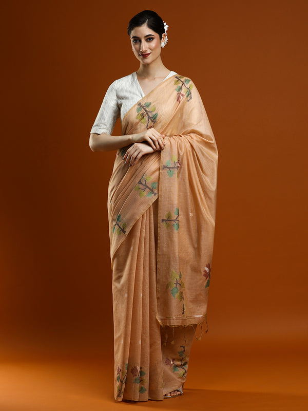 Woven Design Floral Muga Cotton Saree in Beige