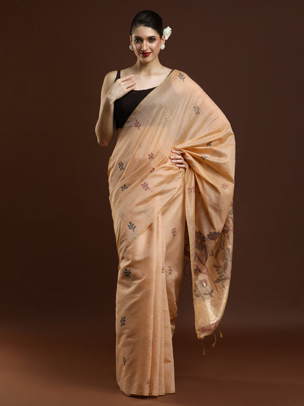 Woven Design Floral Chanderi Cotton Saree in Beige