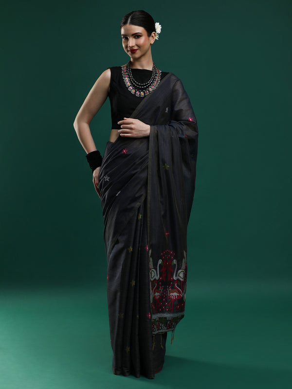 Woven Design Solid Bhagalpuri Linen Saree in Black
