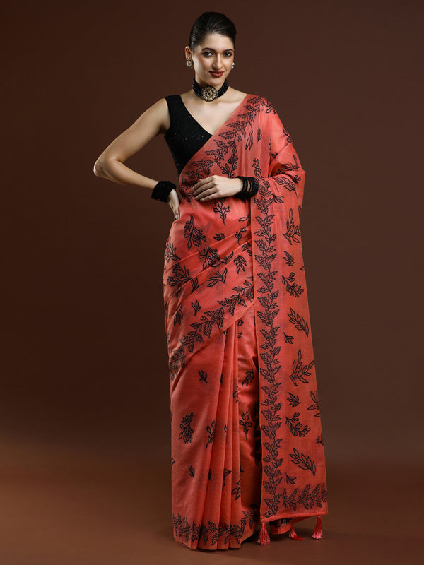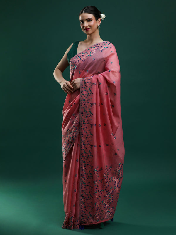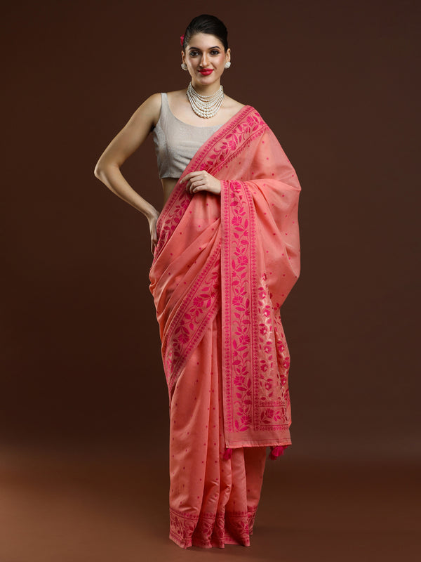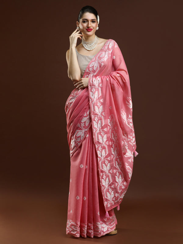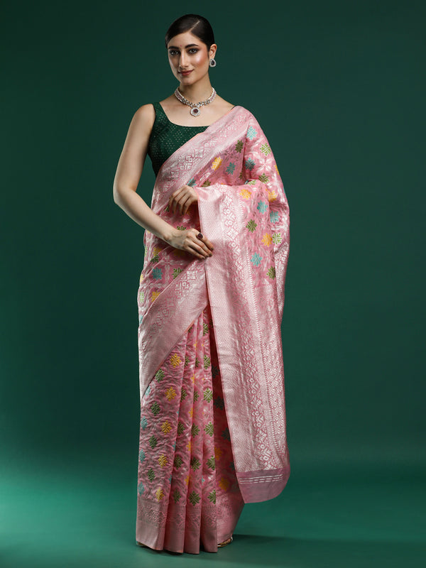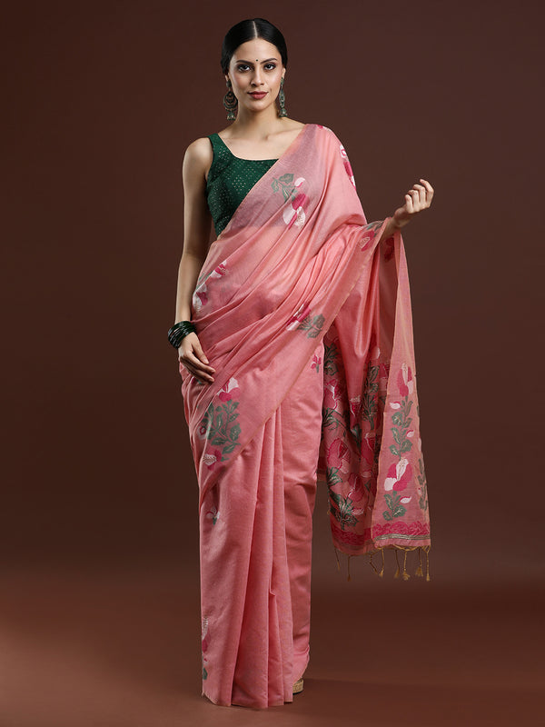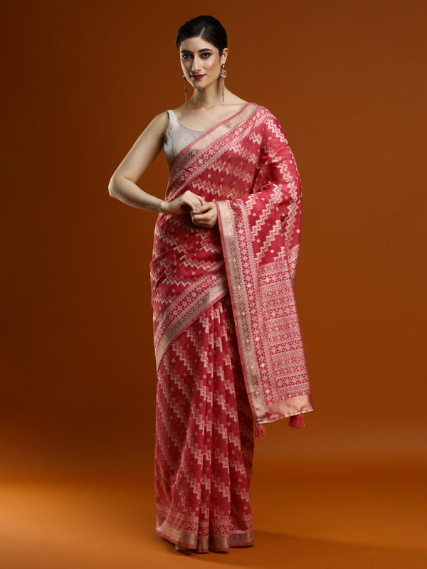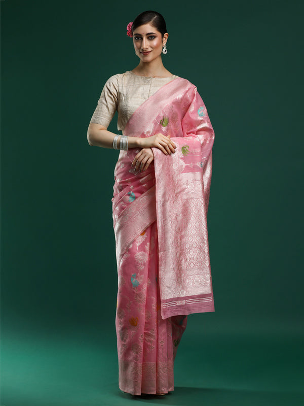 Sarha Women Floral Woven Design Zari Chanderi Saree in Pink