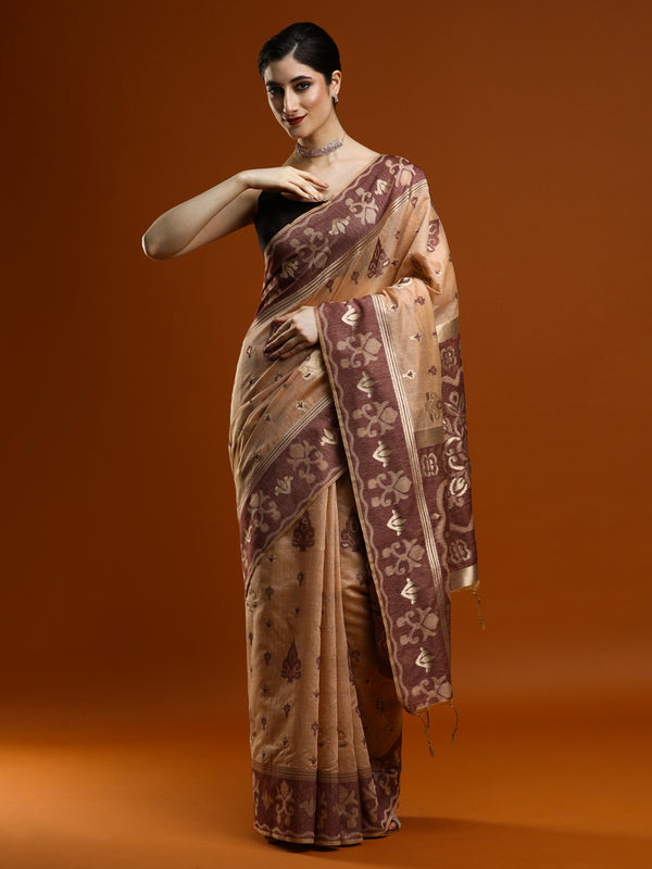 Sarha Ethnic Motifs Zari Chanderi Saree in Light Brown