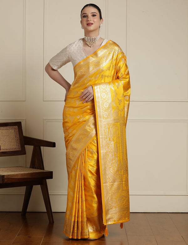 Ethnic Motif Woven Design Zari Banarasi Satin Silk Saree & Blouse Piece in Yellow