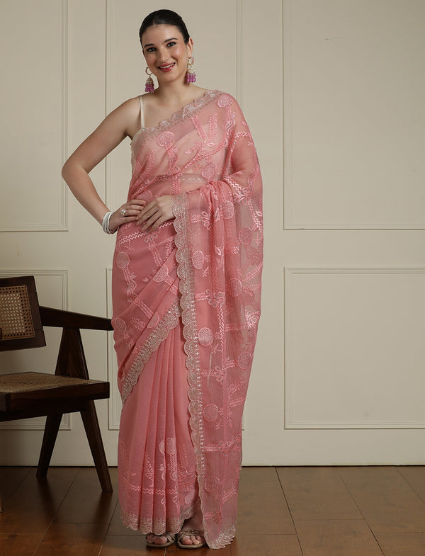 Floral Motifs Embroidered Saree with Unstitched Blouse in Pink