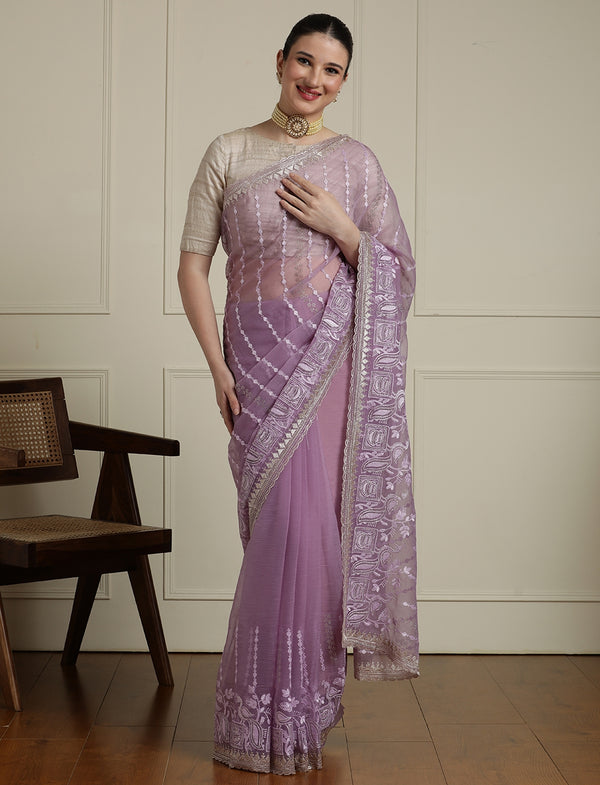 Floral Motifs Embroidered Saree with Unstitched Blouse in Purple